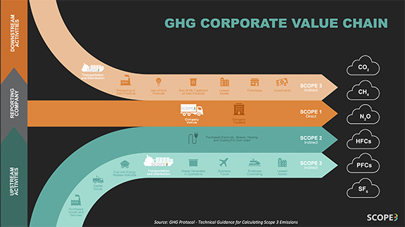 The GHG Protocol Corporate Standard classifies a company’s GHG emissions into three 'scopes'. Scope 1 emissions are direct emissions from owned or controlled sources. Scope 2 emissions are indirect emissions from the generation of purchased energy. Scope 3 emissions are all indirect emissions (not included in scope 2) that occur in the value chain of the reporting company, including both upstream and downstream transport emissions. This is the focus of the Swinburne-Scope3 project.