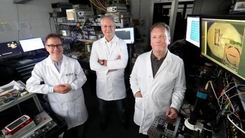 (L-R): Dr Bill Corcoran (Monash University), Professor Moss and Professor Mitchell, the research team that recorded the world's fastest internet speed from a single optical chip.