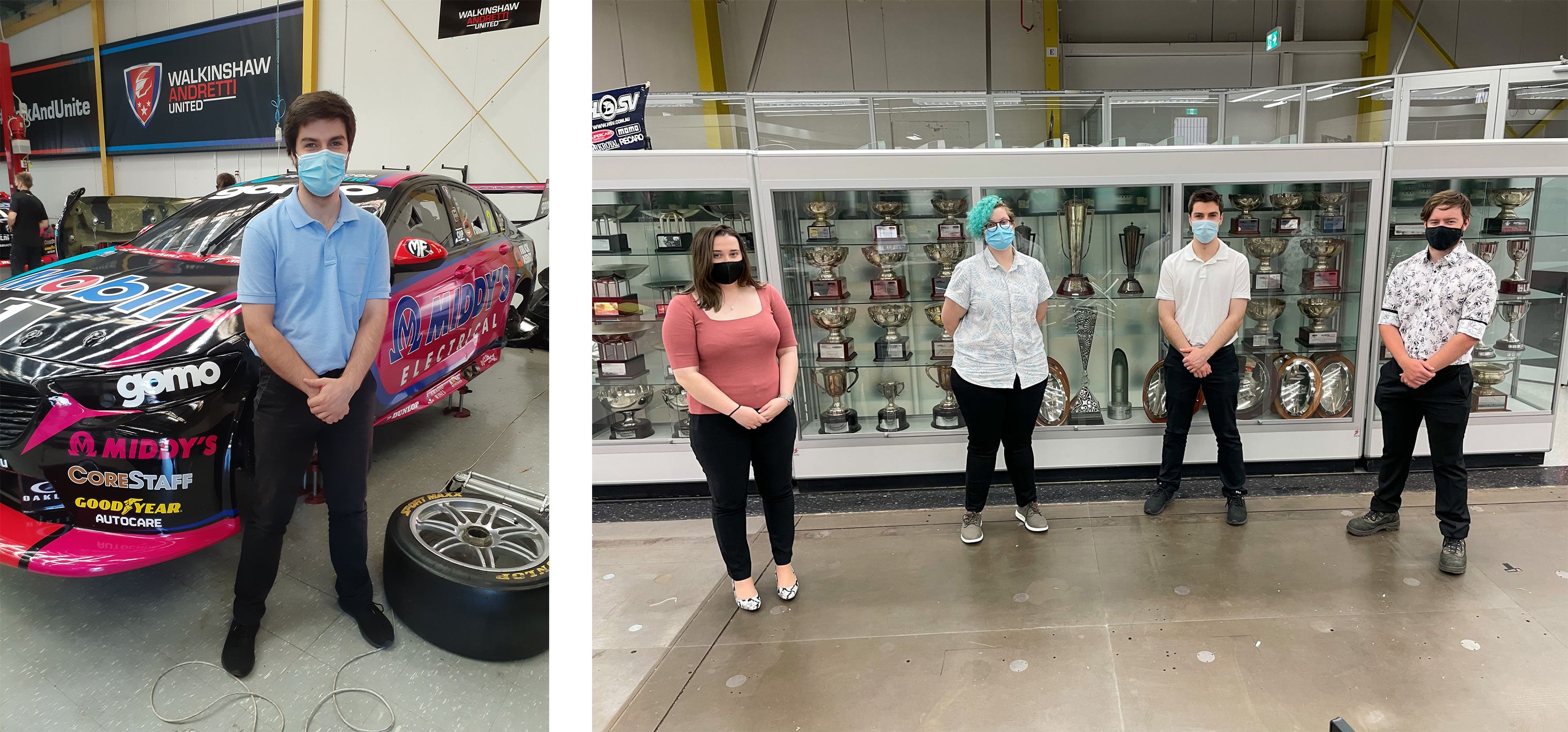 Left: Swinburne student Tom McCausland in front of one of Walkinshaw Andretti United's new supercars. Right: All four Swinburne students undertaking work integrated learning at Walkinshaw Andretti United.
