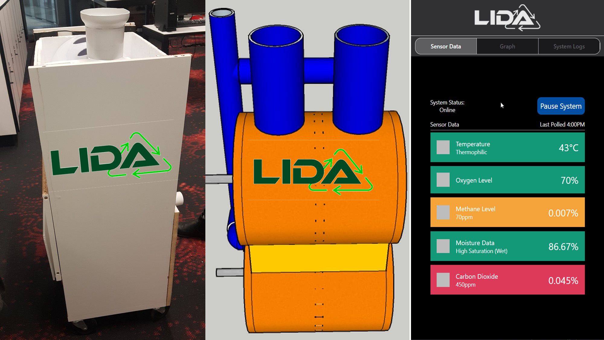 Sensors in the LIDA composting system collect data about oxygen, carbon dioxide, temperature and moisture levels which is uploaded to the cloud and can be viewed on a mobile app.