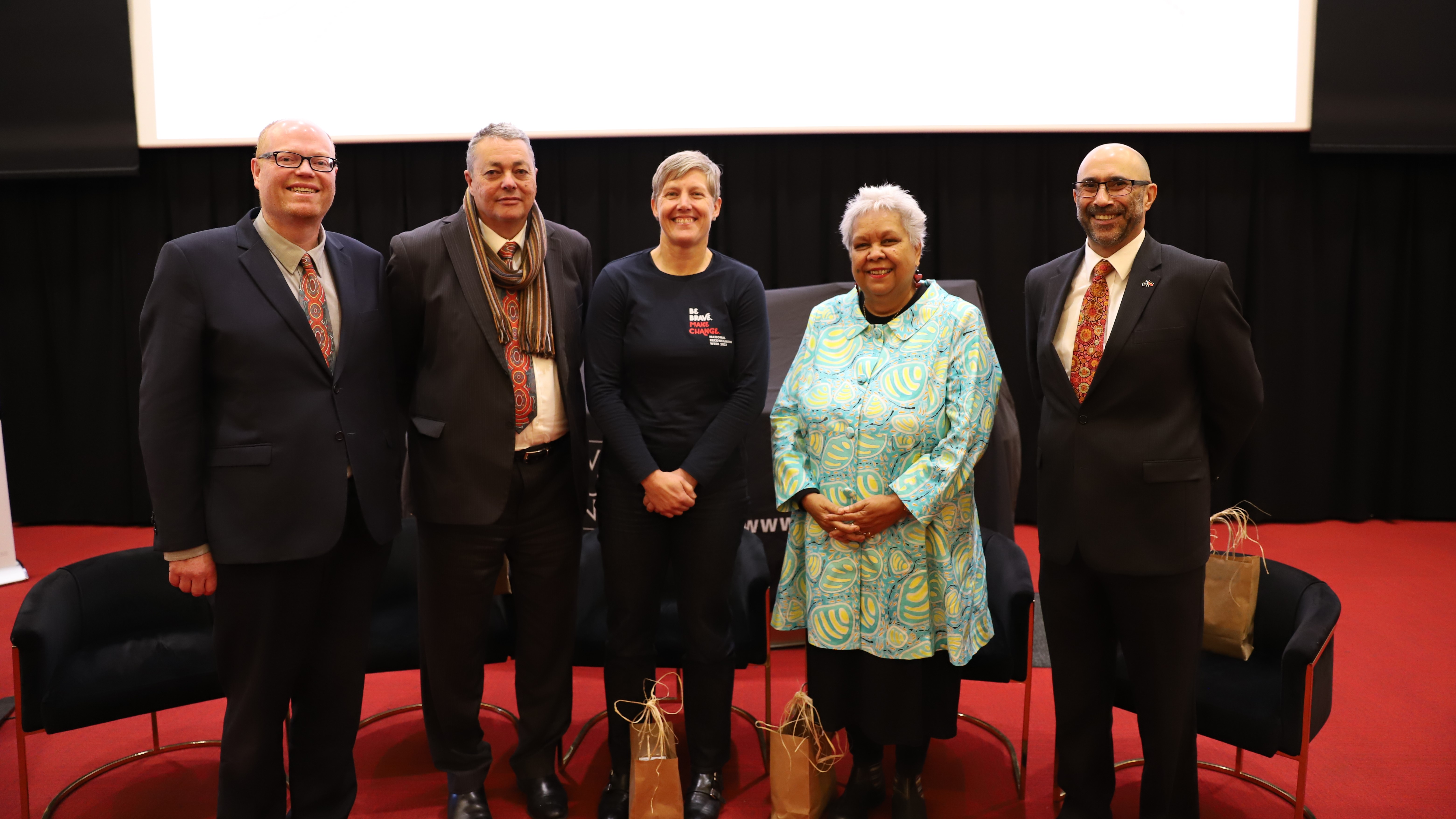 Launch panel for the National Centre for Reconciliation Practice, featuring (from left to right): Professor Andrew Gunstone, Professor John Evans, Melinda Cilento, Dr Jackie Huggins AM FAHA and Ian Hamm.