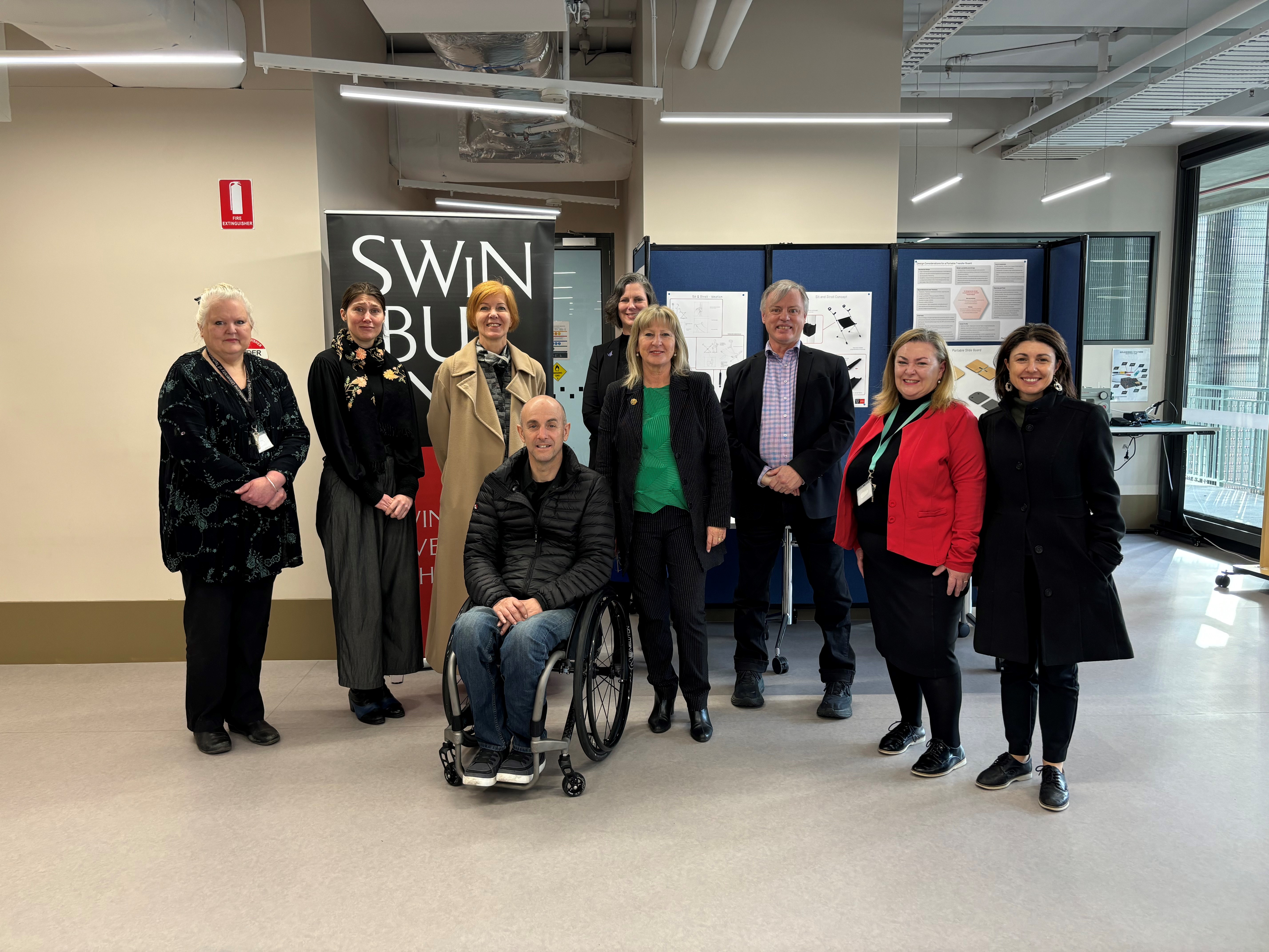 The tour was attended by Swinburne’s Vice-Chancellor and President of Swinburne, Professor Pascale Quester, Deputy Vice-Chancellor of Research, Professor Karen Hapgood, Director of MedTechVic, Professor Rachael McDonald, and Paralympian and Co-founder of ROVE Wheelchairs, Bryce Alman.