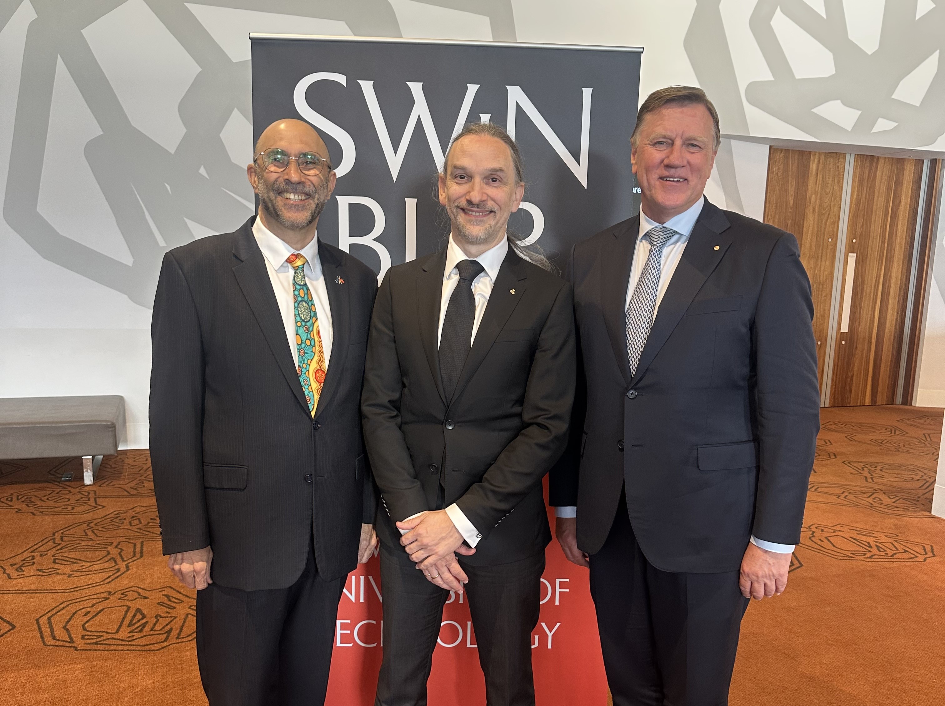 Ian Hamm and Jefa Greenaway with Swinburne University of Technology Chancellor, Professor John Pollaers OAM.