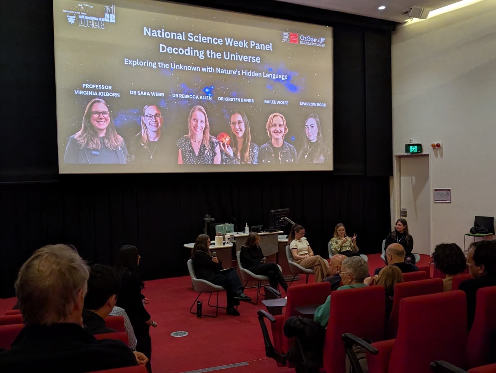 The event began with an outreach fair led by Sparrow Roch and the OzGrav Outreach Ambassadors, where families explored hands-on science activities including Paper Circuits and UV‑Detecting Beads. OzGrav then hosted a held a panel event titled Decoding the Universe, bringing together some of Australia’s brightest astrophysicists, including Professor Virginia Kilborn, Dr Kirsten Banks, Dr Rebecca Allen and OzGrav PhD students Bailee Wolfe and Sparrow Roch. The panel explored a wide range of topics, from AI-discovered cosmic flashes and gravitational waves, to radio maps of the Milky Way and the cultural star knowledge of First Nations and Native American peoples.