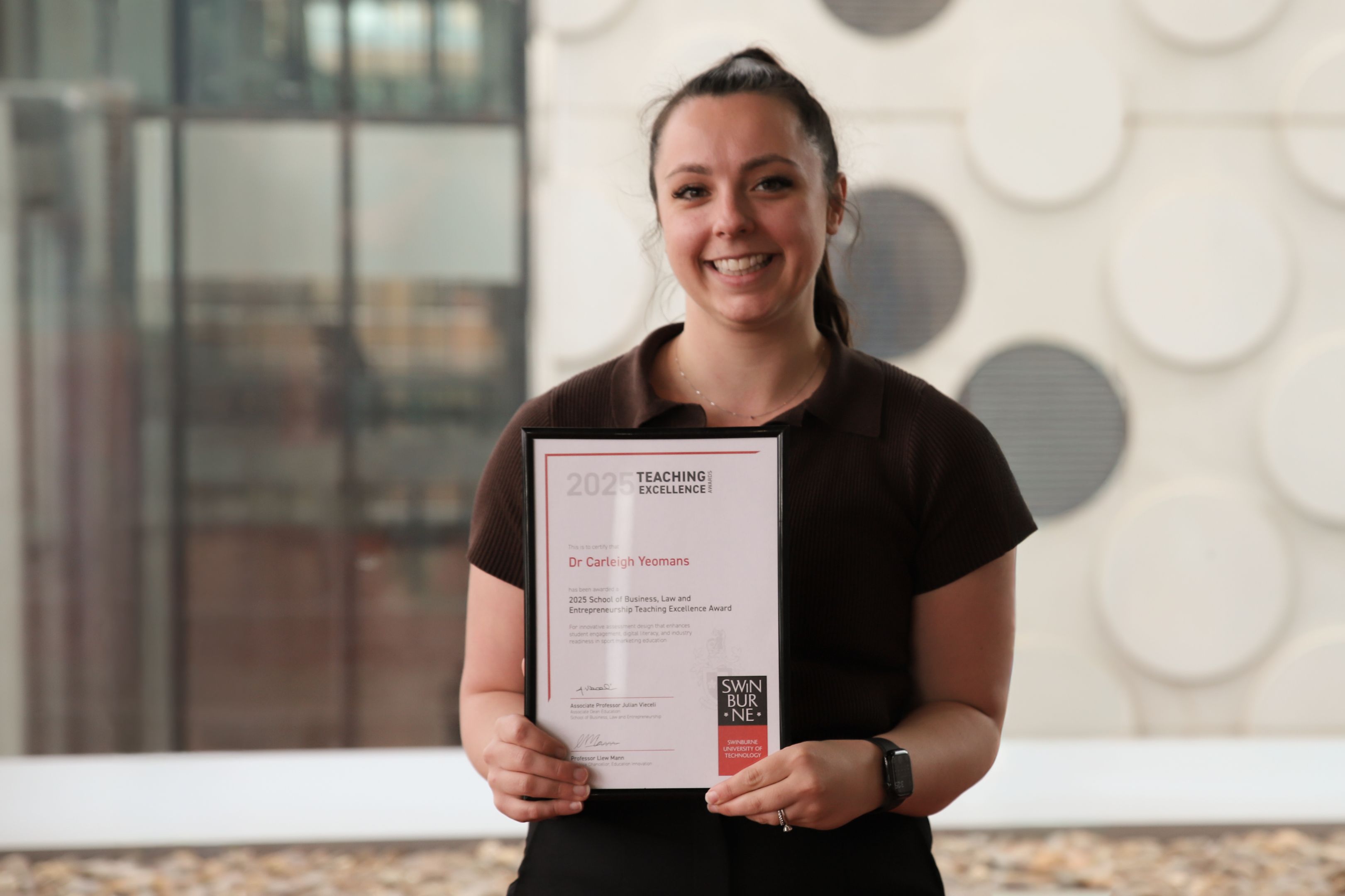 Dr Carleigh Yeomans, Lecturer in Sport Management, has been recognised for an innovative assessment design that enhances student engagement, digital literacy and industry readiness in sport marketing education.
