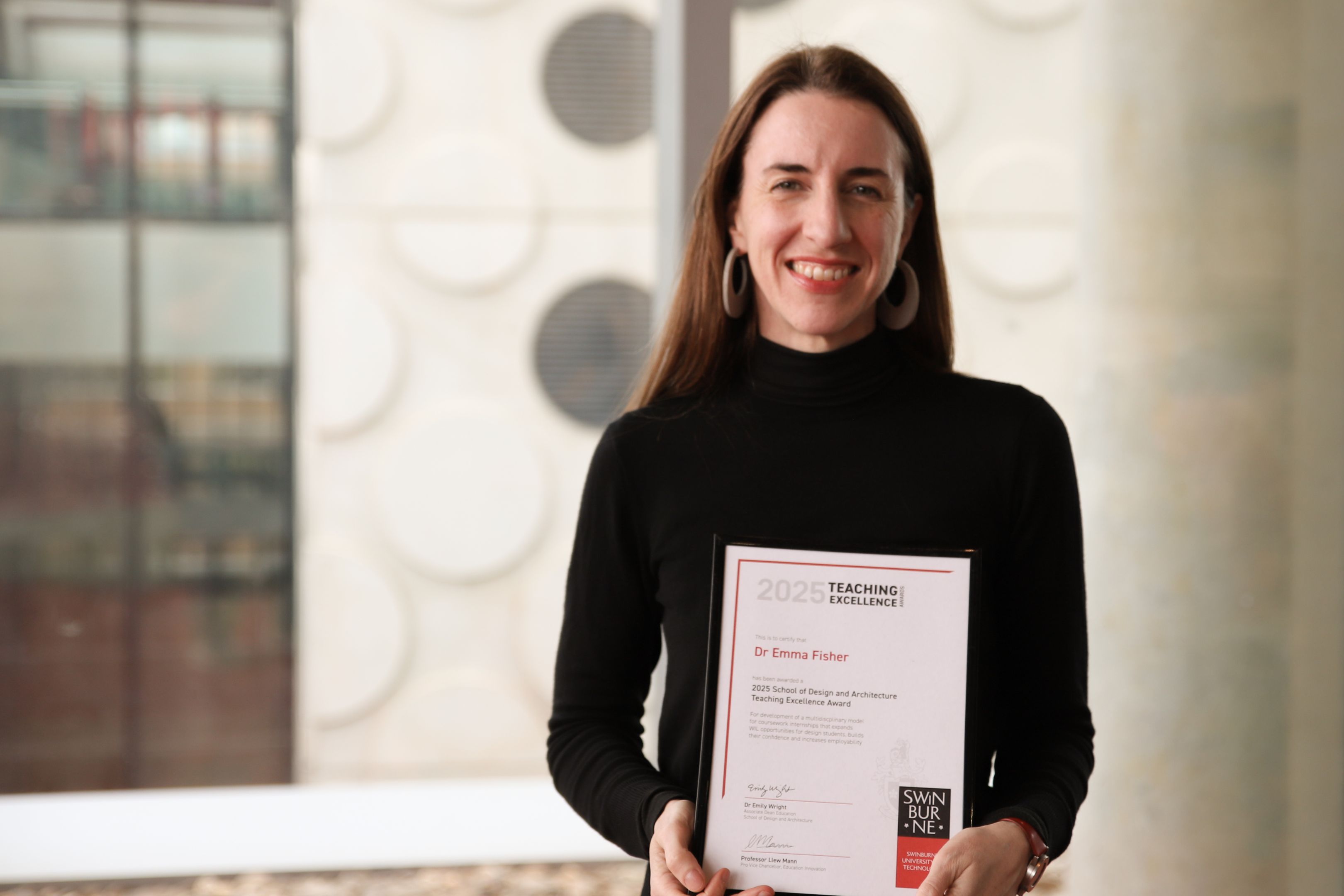 Dr Emma Fisher, Lecturer in Communication Design, has been recognised for developing a multidisciplinary model for coursework internships that expands work-integrated learning (WIL) opportunities for design students, builds their confidence and increases their employability.