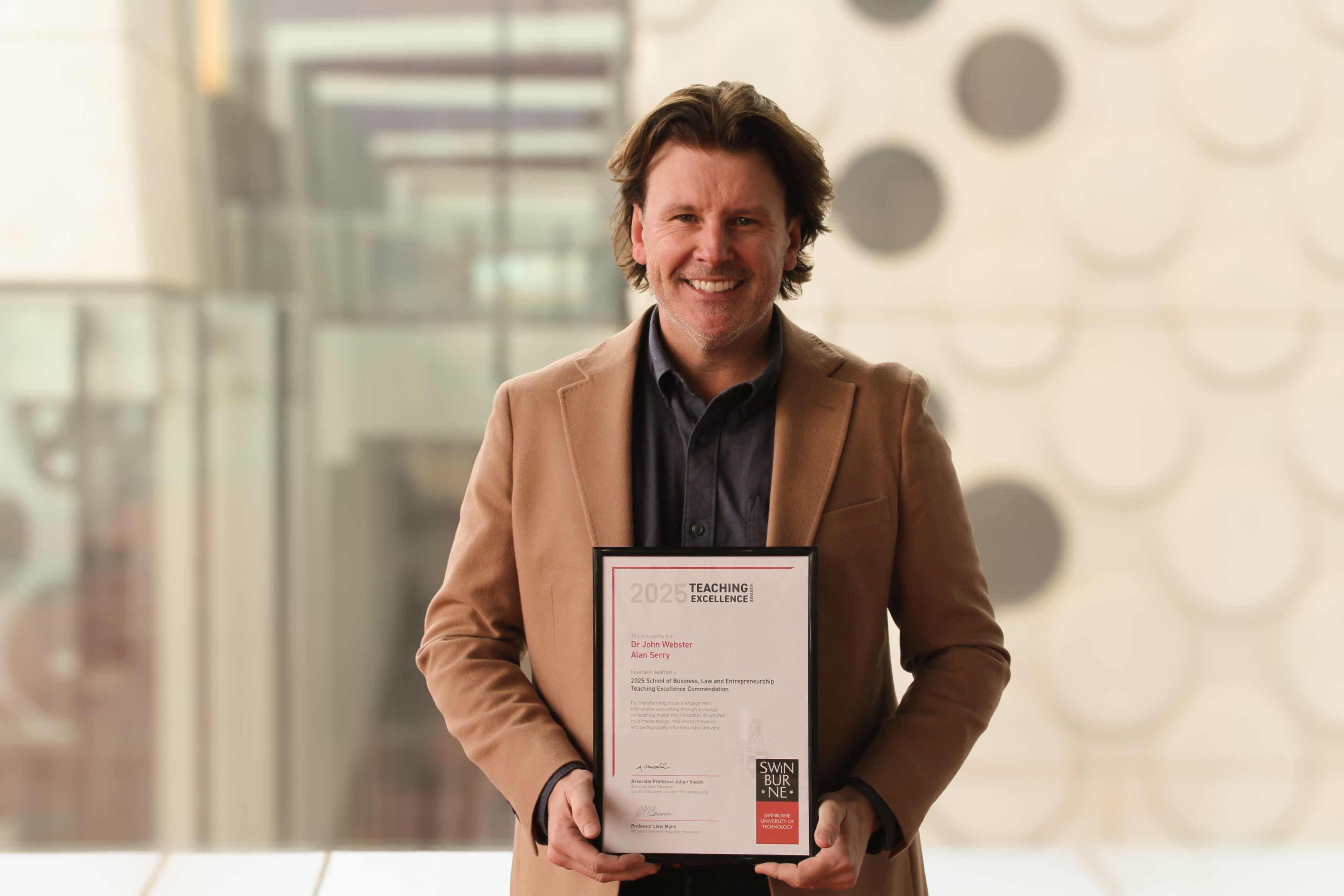 Dr John Webster, Senior Lecturer in Accounting, and teaching sessional Alan Serry have been recognised for transforming student engagement in first-year accounting through a dialogic co-teaching model that integrates structured multimedia design, real-world relevance and pedagogically informed video delivery.