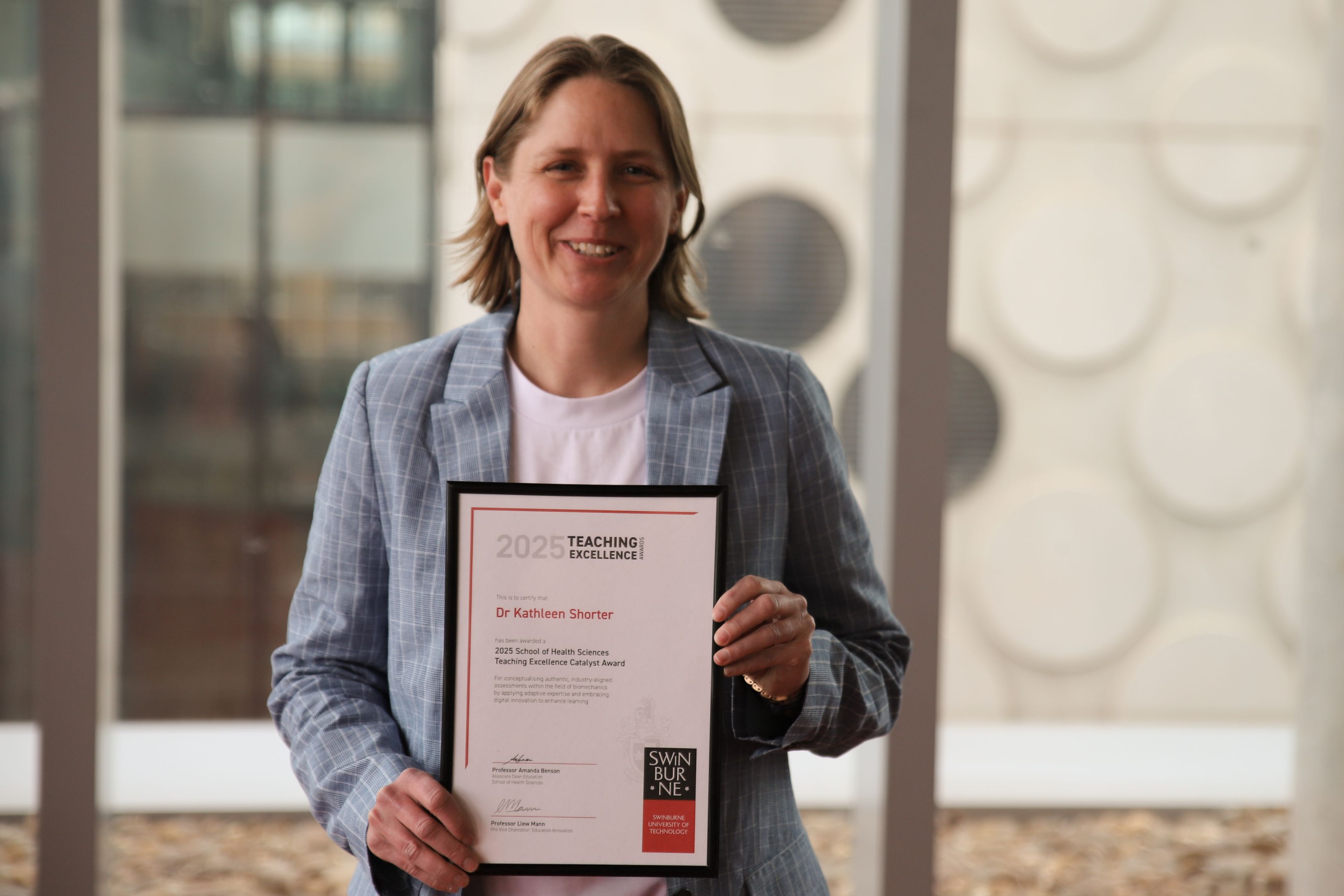 Dr Kathleen Shorter, Senior Lecturer in Biomechanics, has been awarded for conceptualising authentic, industry-aligned assessments within the field of biomechanics by applying adaptive expertise and embracing digital innovation to enhance learning.