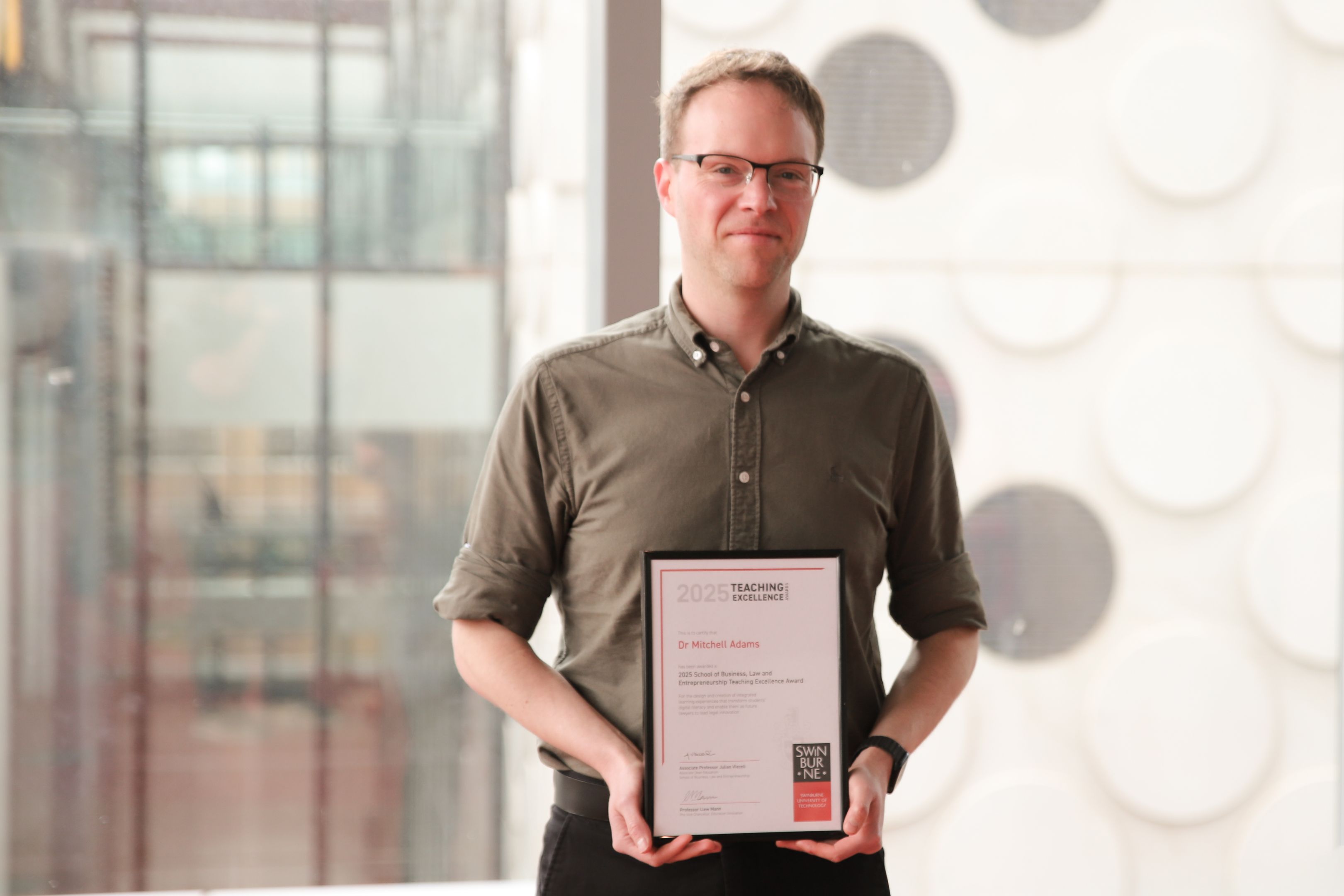 Dr Mitchell Adams, Senior Lecturer at Swinburne Law School, has been awarded for the design and creation of integrated learning experiences that transform students’ digital literacy and enable them as future lawyers to lead legal innovation.
