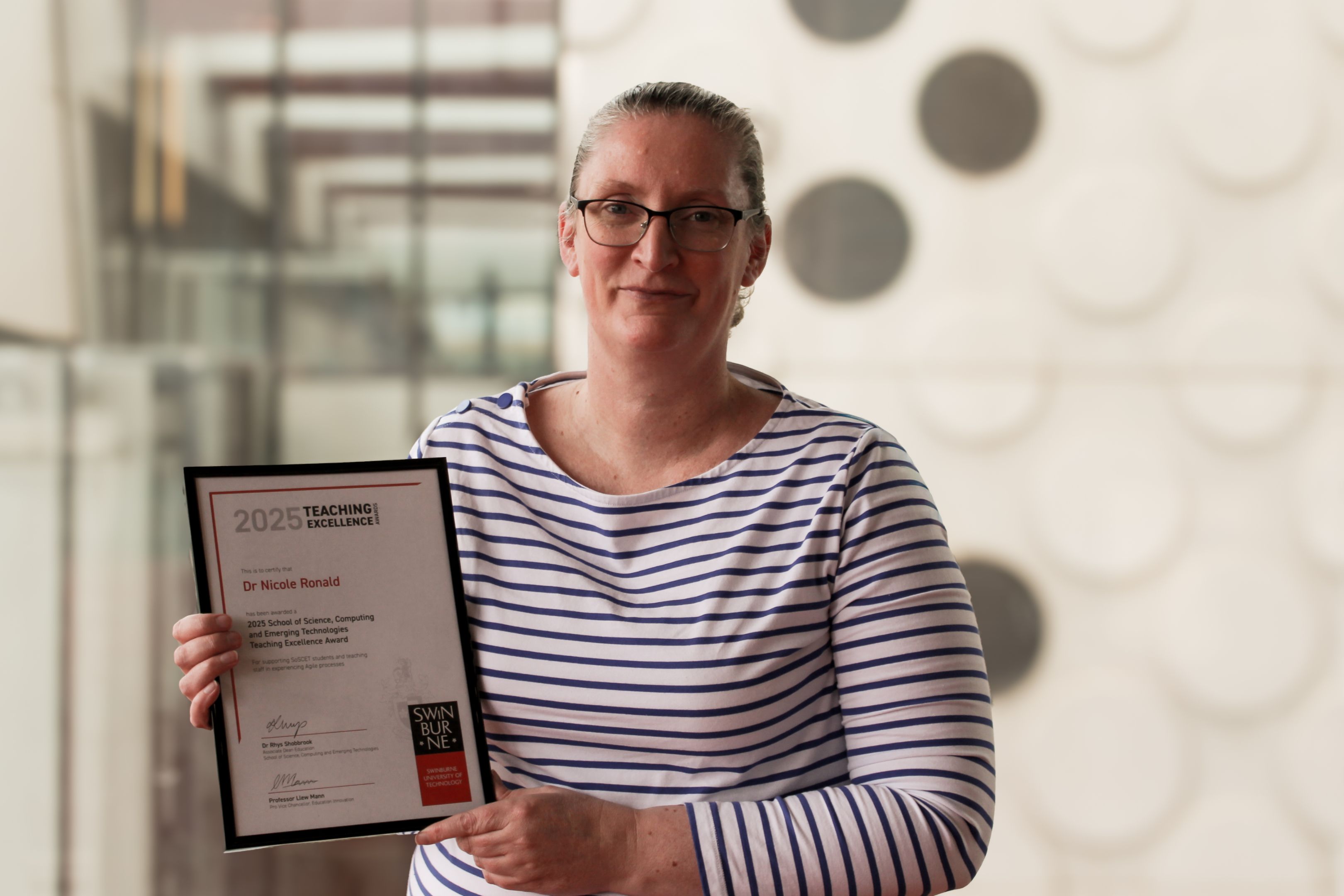 Dr Nicole Ronald, Lecturer in Computer Science and Software Engineering, has supported students and teaching staff in Agile processes. Since 2022, the School’s staff and students have meaningfully engaged with Agile methodologies through industry-level games, tailored Agile ceremonies and collaborative teaching strategies. Dr Ronald’s work has improved curriculum design, supported staff and student development, and received consistent positive feedback.