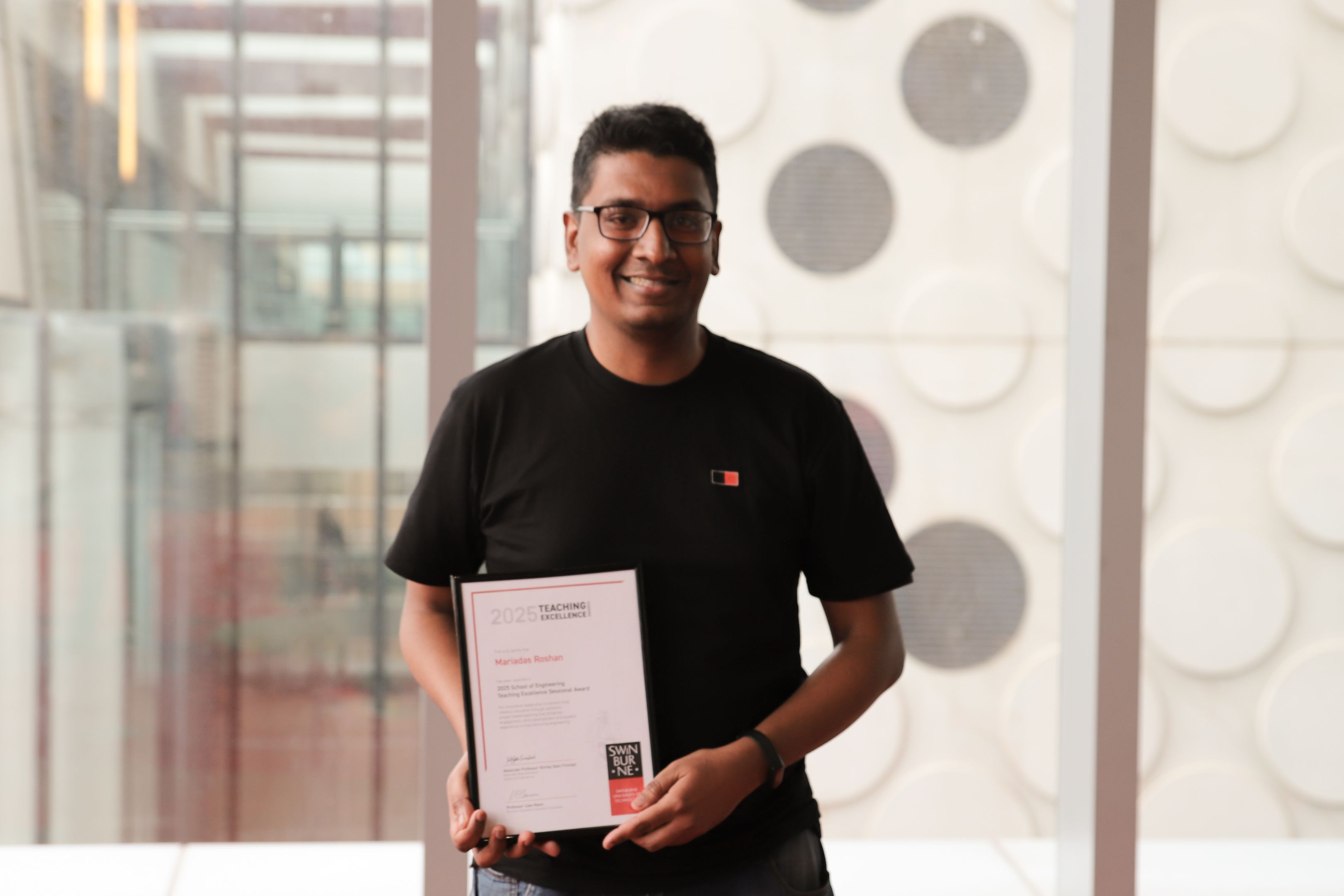 Dr Mariadas Roshan, Research Fellow in Collaborative Robotics, has been recognised for innovative leadership, transforming robotics education through authentic project-based learning that enhances engagement, skills development and student experience in manufacturing engineering.