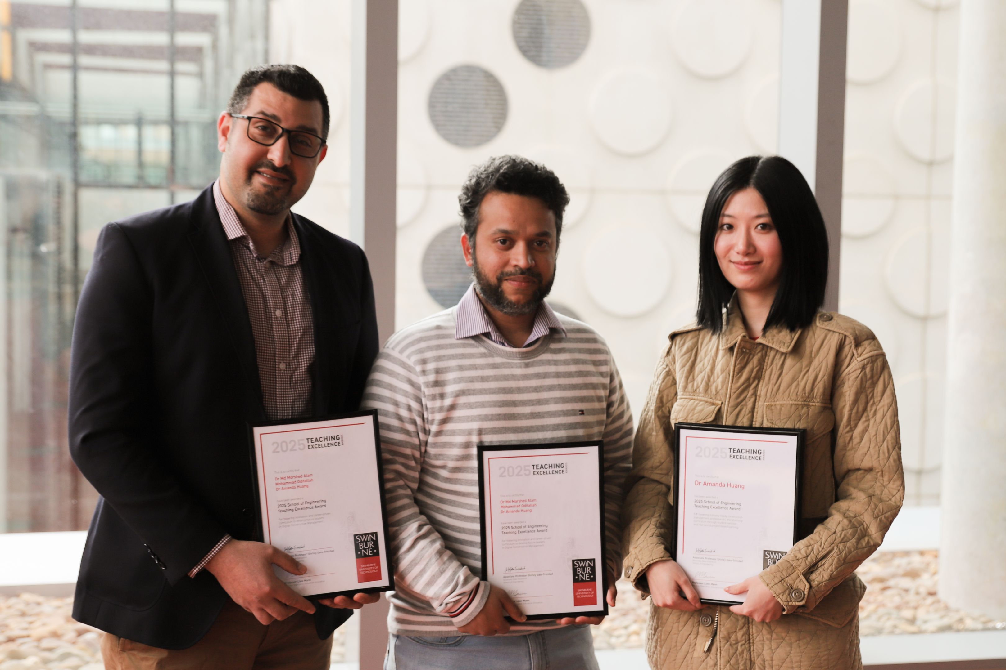 Dr Md Morshed Alam, Mohammad Oditallah and Dr Amanda Huang have been recognised for fostering innovation and a career-driven curriculum to develop future leaders in digital construction management.
