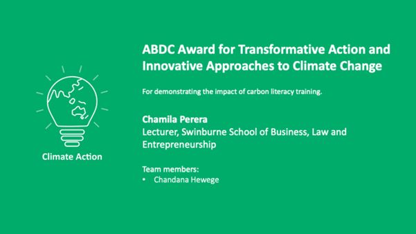 Dr. Chamila Perera and Associate Professor Chandana Hewege of Swinburne University’s School of Business, Law and Entrepreneurship have been awarded the Australian Business Dean’s Council (ABCD) Award for Transformative Action and Innovative Approaches to Climate Change.