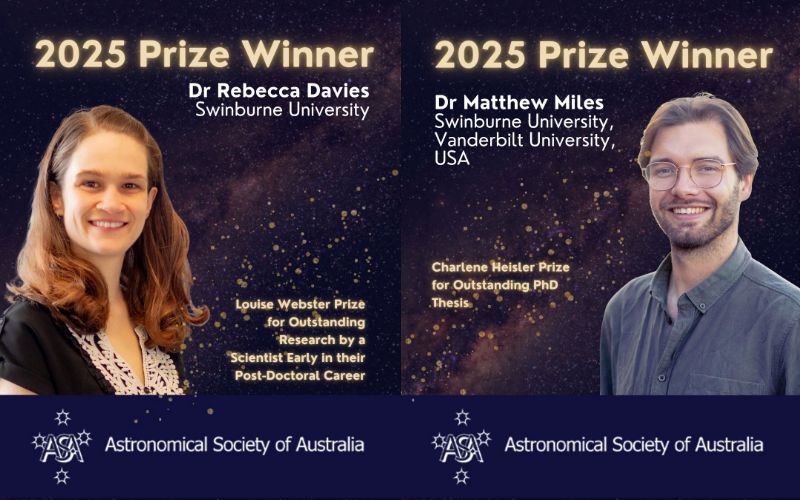 Swinburne astronomers Dr Rebecca Davies and Dr Matthew Miles have been recognised by the Astronomical Society of Australia (ASA), securing two of the six awards. Dr Rebecca Davies has been awarded the Louise Webster Prize for outstanding research by an early-career scientist, while Dr Matthew Miles has been awarded the Charlene Heisler Prize for Outstanding PhD Thesis.