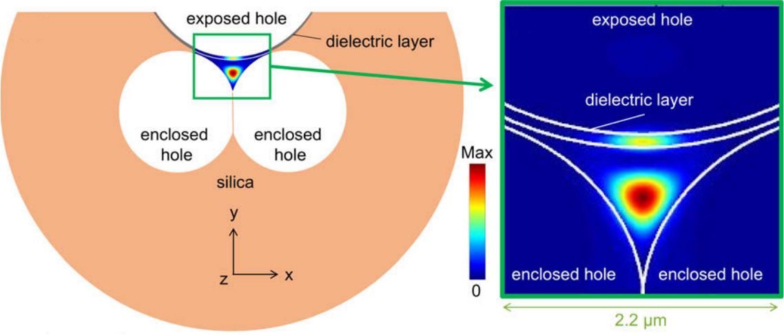 Schematic of a microstructured exposed-core fibre and theoretical mode profile in the fibre core and a thin dielectric layer deposited on top of the core.