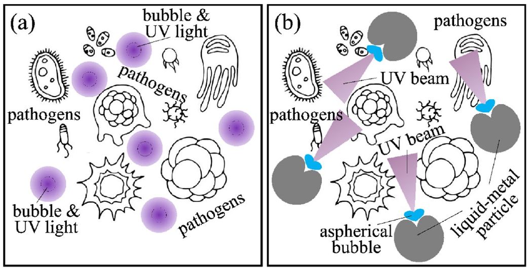 Illustration of the process of water disinfection using (a) spherical cavitation of gas bubbles in water and (b) aspherical cavitation of gas bubbles in water with liquid-metal particles.