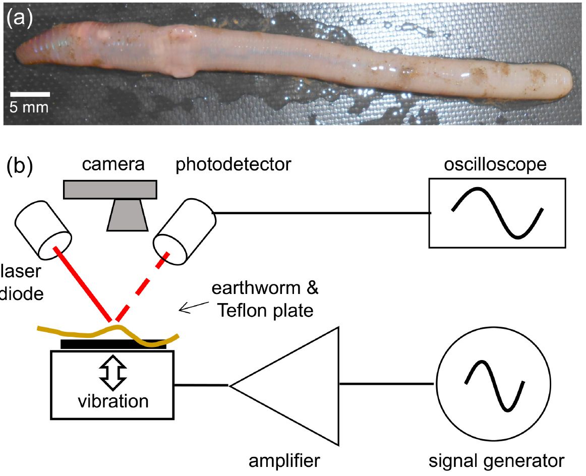 Photograph of an anaesthetised earthworm and schematic of the experimental setup used to measure Faraday waves propagating on the surface of the worm.