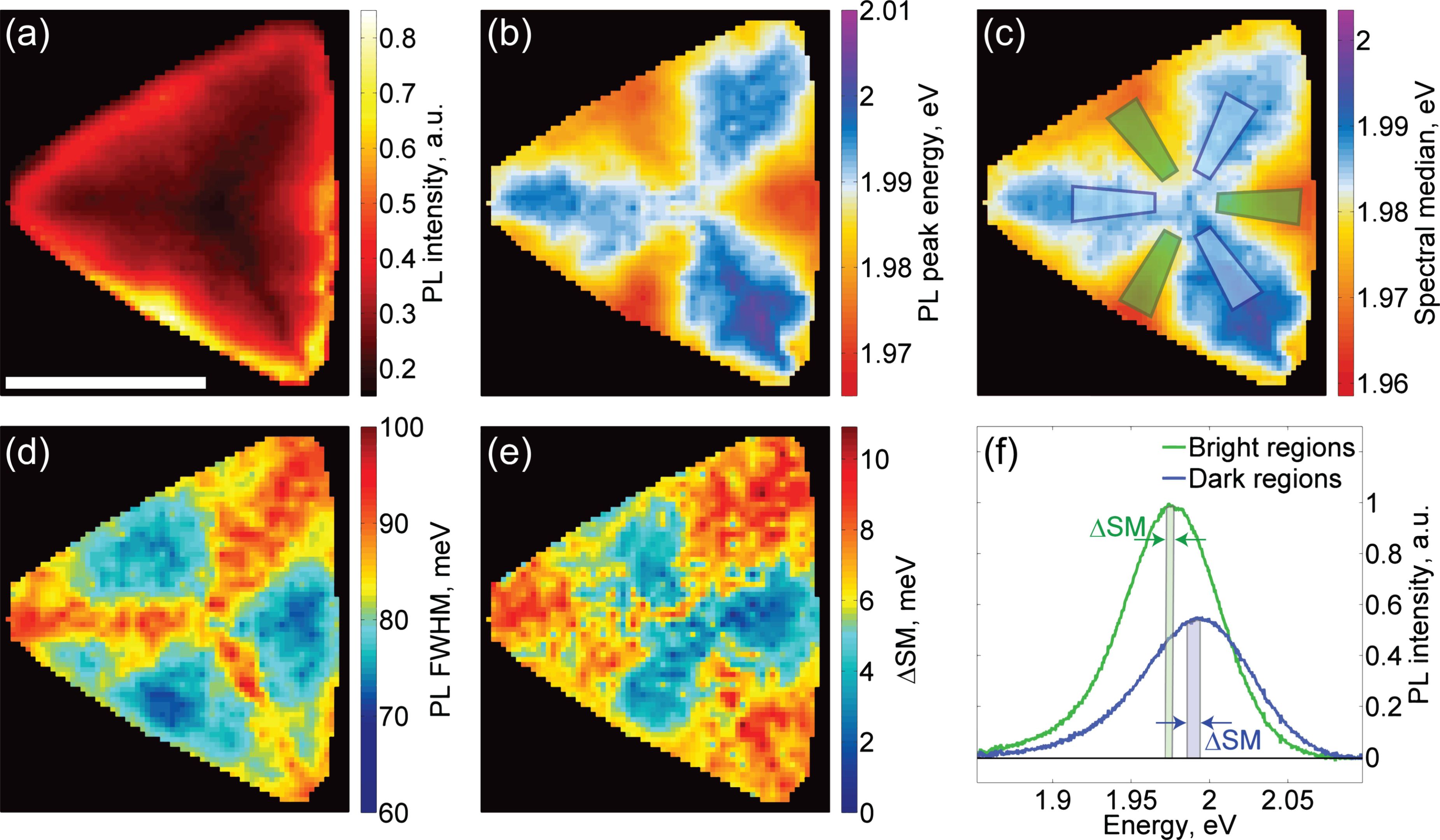 Atomically thin two-dimensional semiconductors (like the WS2 shown here) possess many interesting and potentially useful properties, which we are exploring and seeking to control. Here we map the spectral properties from a CVD grown flake of WS2. [2D Materials 7, 025008 (2019)].